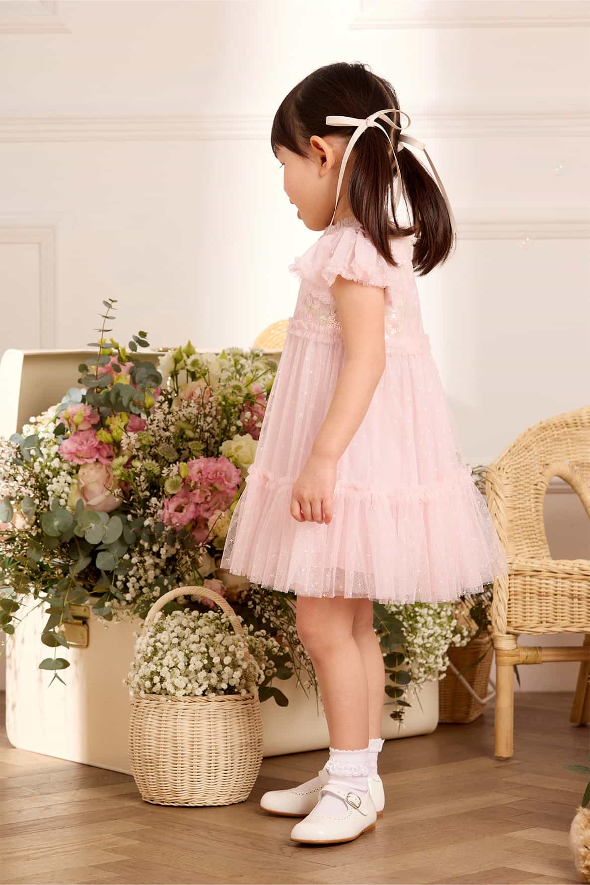 NEW SEASON. The Confetti Bodice Baby Dress in Peony Pink/Multi. This dress features a sequin-embellished bodice with delicate floral motifs and confetti detailing. Soft tulle frills adorn the neckline, bodice, and shoulders, while frilled sleeves create a frothy effect. The gently gathered skirt is finished with playful frills for added volume. Lined in soft cotton voile for comfort, the set includes matching cotton dobby bloomers, delicately edged with frills. The perfect dress for your little one’s upcoming special occasion.
