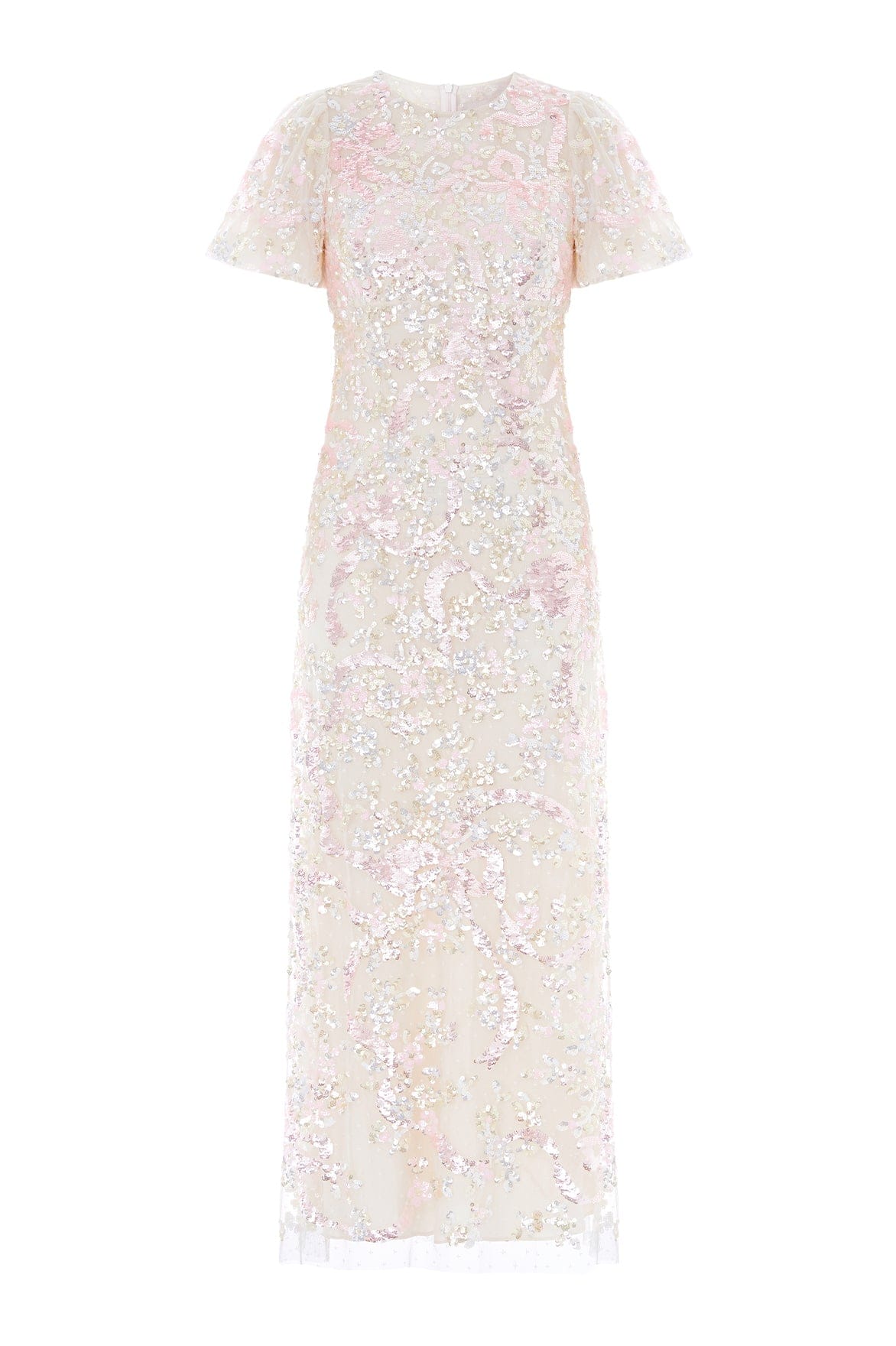 NEW SEASON. The Dancing Ribbon Puff Sleeve Gown in Cream/Multi. Exquisite sequin artwork depicts dancing ribbons and floral motifs in an organic trailing formation across the gown. Designed with puff sleeves and a slim silhouette, this style elongates the figure with delicate sparkle.