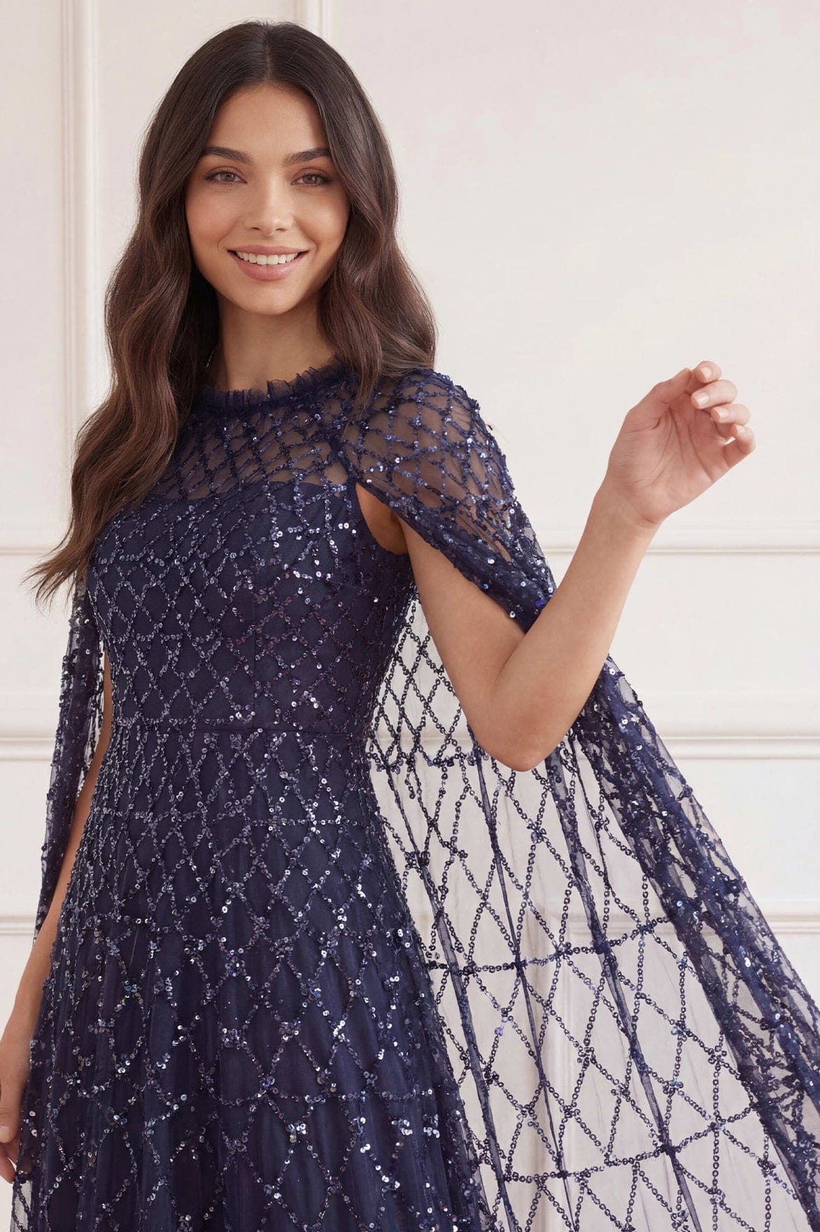 The Heart Lattice Ankle Gown in Midnight. This gown is decorated with intricate embellishments made using the smallest sequins for exquisite detailing. Beautifully designed with heart-shaped motifs in a lattice layout. This gown features our new floor-length cape for romantic detailing and a statement look. Make an entrance at your next event.