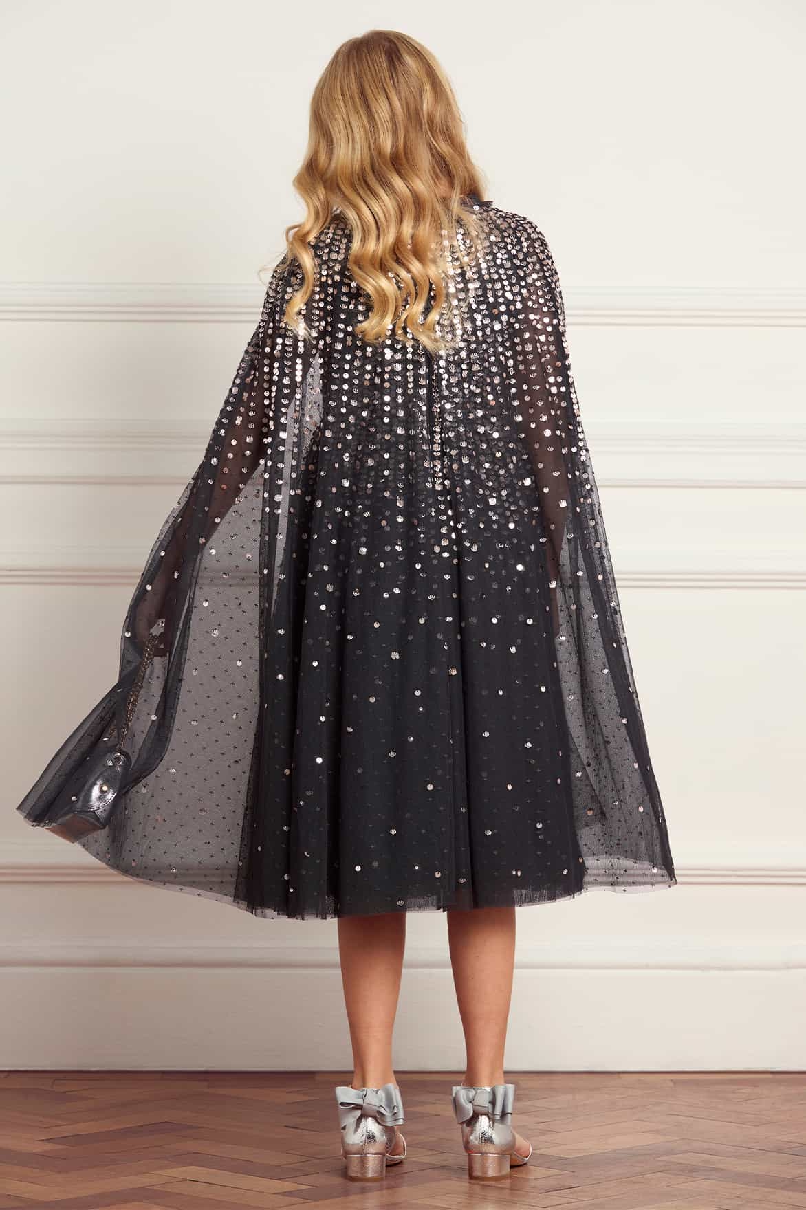 NEW SEASON. The Moonlight Sequin Cape Kids Dress in Graphite/Metallic. Sequins sparkle across dark graphite tulle, catching the light with metallic brilliance. Cape sleeves create drama and movement, while the shorter length ensures comfort and ease for young wearers. Pairs beautifully, for a matching mummy and me look, with the Moonlight Sequin Cape Sleeve Ankle Gown in Graphite/Metallic from the womenswear line.