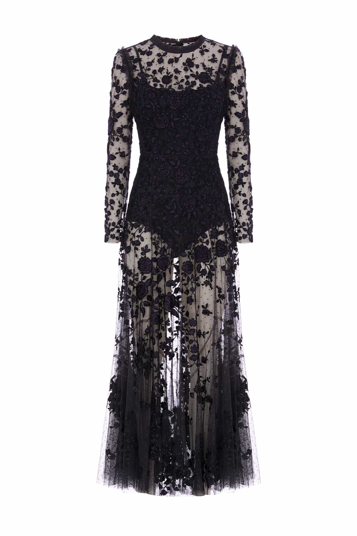 The Rosa Sheer Ankle Gown in Graphite. An ethereal piece with luxurious contrast rose embroidery. Featuring a sheer outer layer and an integrated powermesh bodysuit for coverage, this style blends vintage artistry with a modern silhouette. Make a statement in this showstopping style.