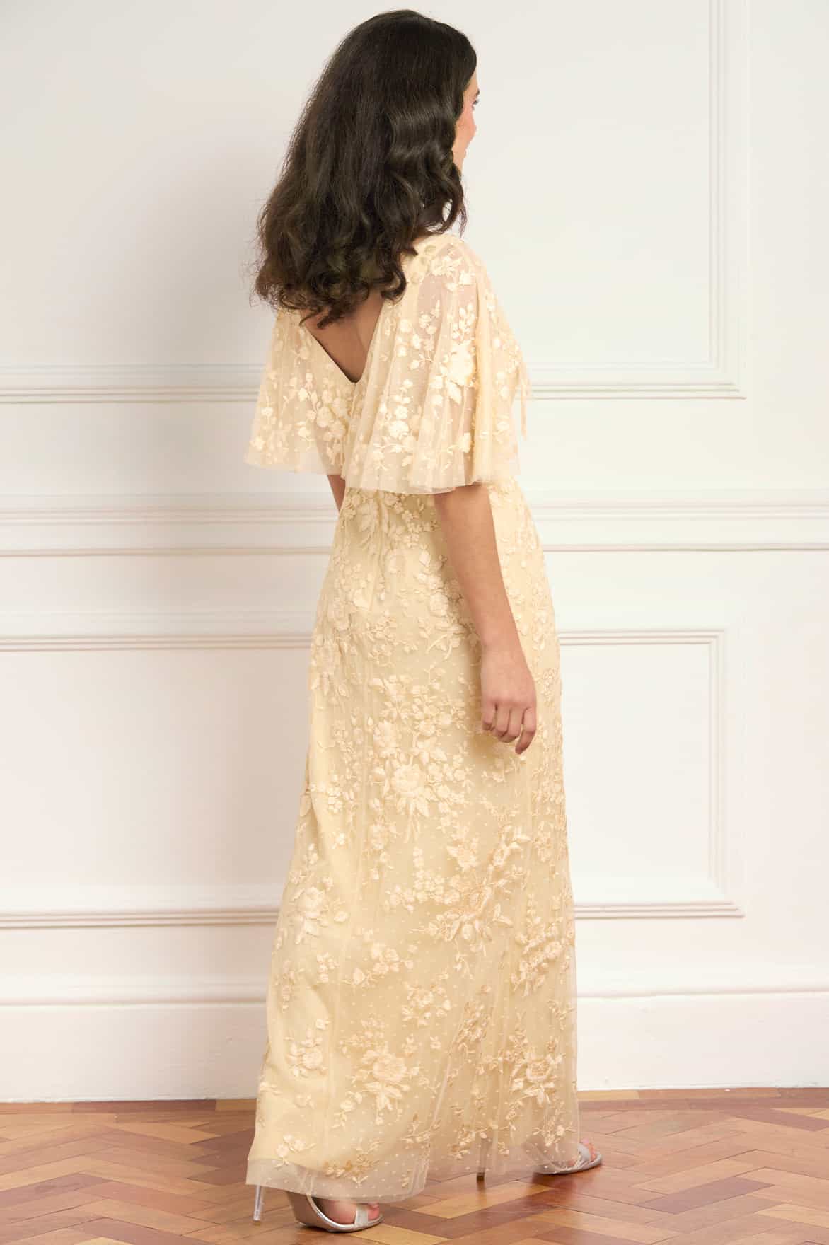 NEW SEASON. The Rosa V-Neck Cape Gown in Lemon Sorbet. This elegant gown features signature floral embroidery inspired by romantic garden landscapes. Designed with an integrated cape and a slim silhouette, complemented by a bias-cut lining for a smooth, body-skimming fit and effortless wear.