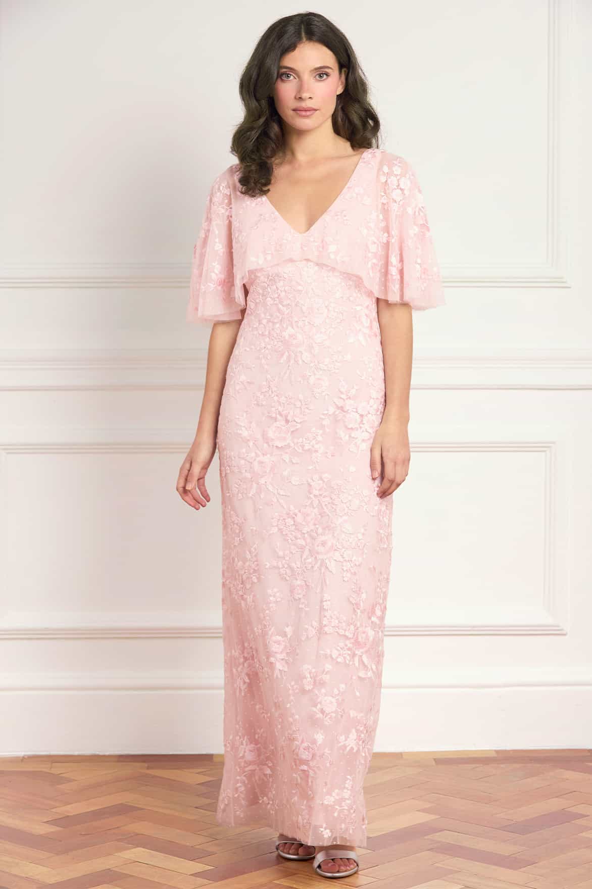 NEW SEASON. The Rosa V-Neck Cape Gown in Peony Pink. Adorned with delicate floral embroidery inspired by early 1900s artwork, this gown offers a refined, romantic silhouette. Finished with an integrated cape and a slim fit, enhanced by a bias-cut lining for fluid movement.