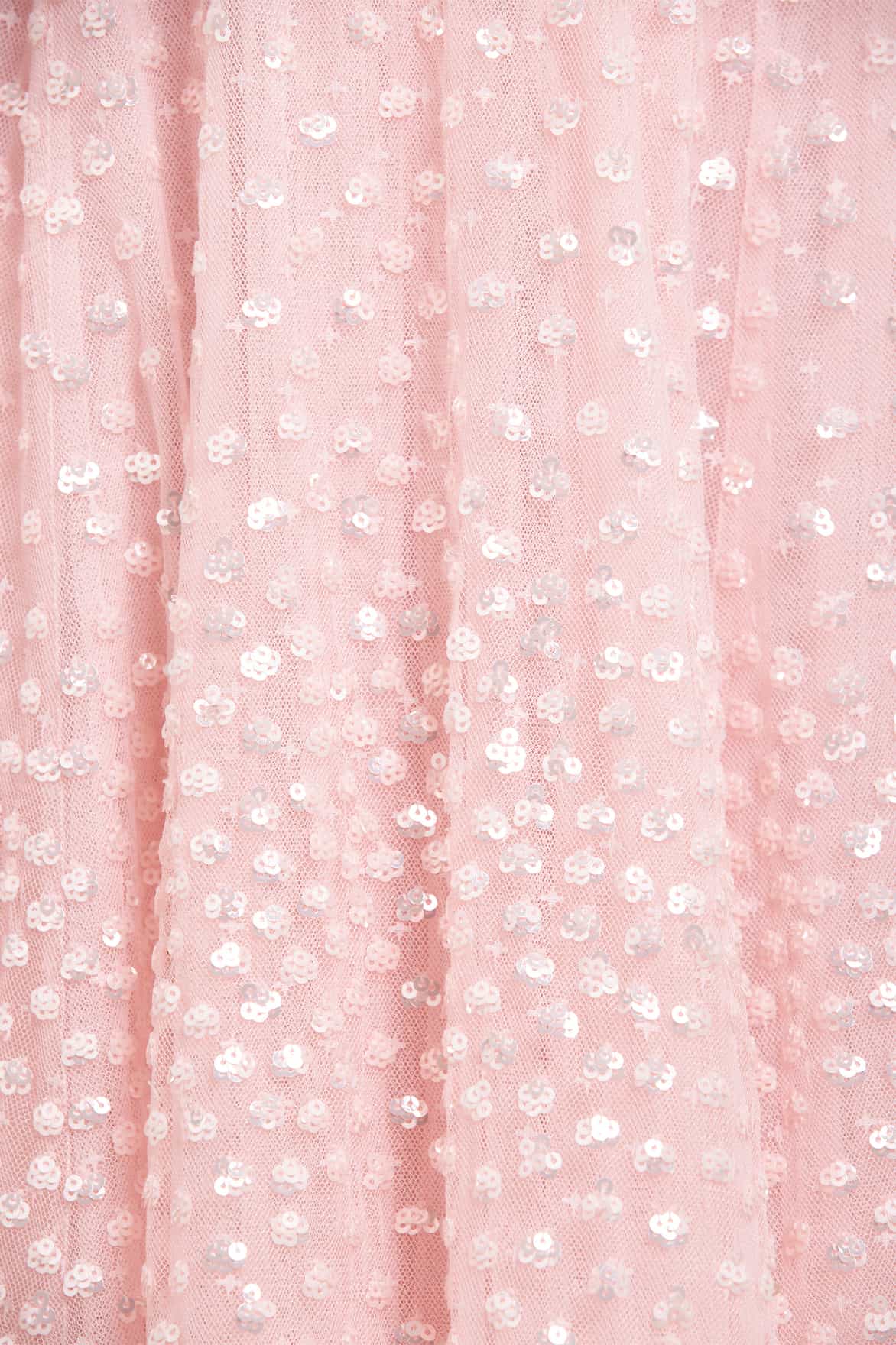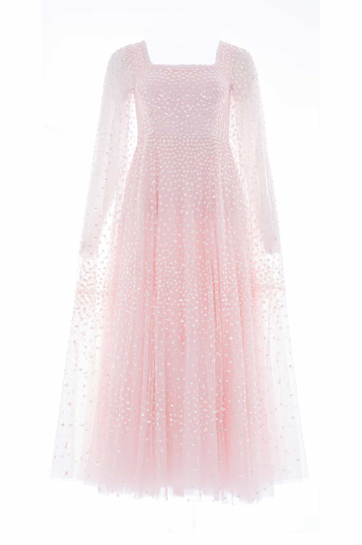The Scatter Dot Cape Sleeve Ankle Gown in Dusk Pink. This embellished gown is decorated with exquisite shimmering dot motifs, undulating in wave formations for a captivating glittering effect. Designed with a sweeping floor-length cape for romantic detailing and a statement look. The flattering square neckline is trimmed with signature Needle & Thread tulle frills. The skirt is made up of generous layers of net and tulle with a sweeping hemline. The perfect choice for an upcoming special occasion and beyond.
