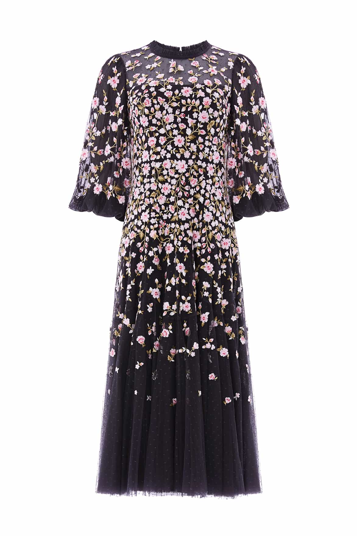 NEW SEASON. The Sylvia Rose Round Neck Ankle Gown in Graphite/Multi. Embroidered roses in multi-tonal threads cascade across graphite tulle, with scattered ditsy motifs adding softness. The slim silhouette and round neckline make this gown both wearable and impactful; perfect for modern romance.
