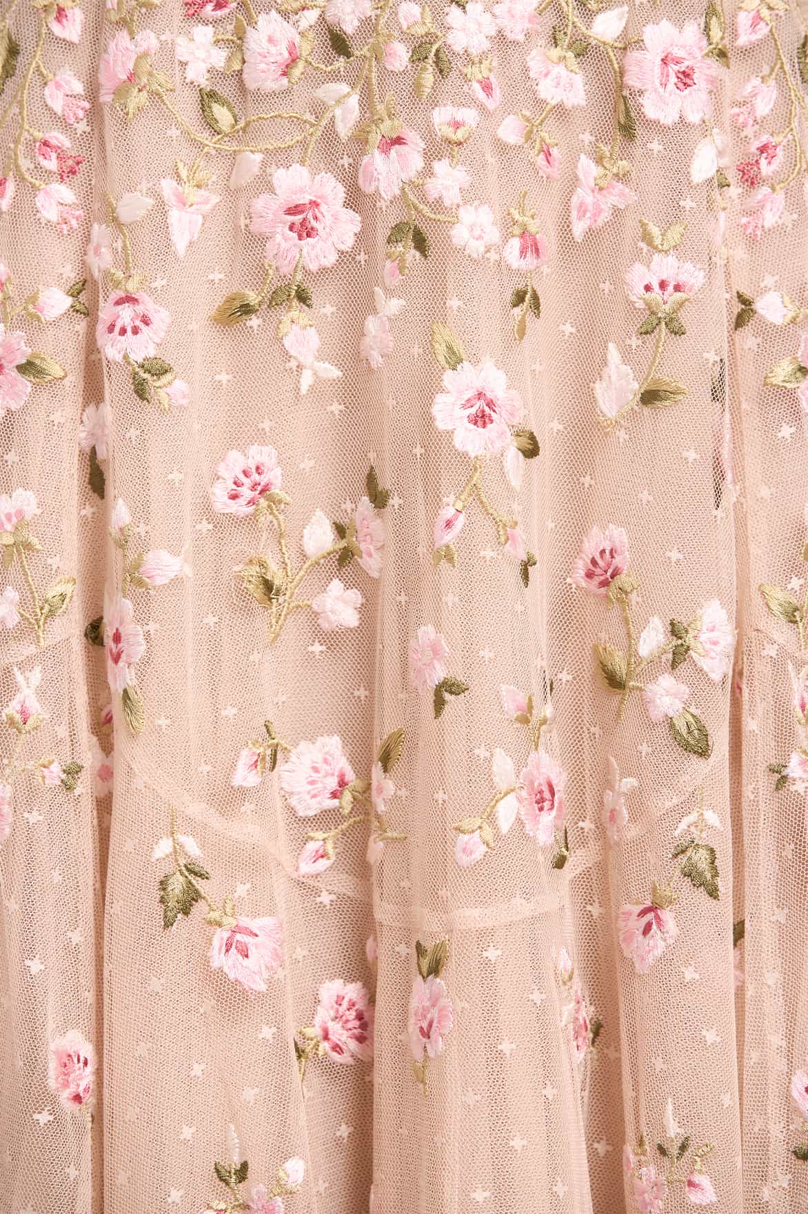 - Kisses tulle decorated with floral embroidery.