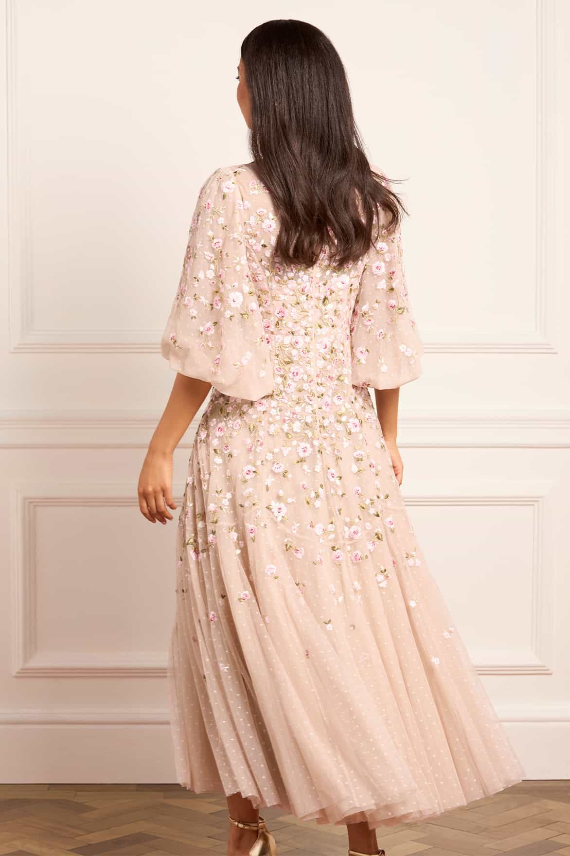 NEW SEASON. The Sylvia Rose Round Neck Ankle Gown in Oyster/Multi. Richly embroidered roses and scattered ditsy blooms adorn layers of tulle, softened by the luminous base. The gown’s slim silhouette and ankle length make it wearable yet impactful, while the multi-coloured embroidery evokes timeless artistry.