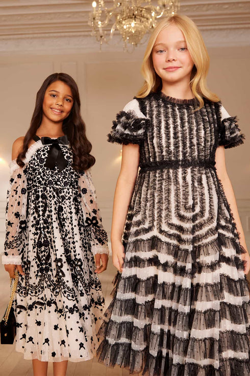 The Adeline Off-Shoulder Kids Dress in Cream/Graphite. Inspired by delicate Victorian lace, this dress is adorned with floral embroidery and shimmering sequin highlights. Designed with off-shoulder sleeves adding a soft, romantic touch. A charming mini version of the women’s gown, style with the matching Adeline Gown for a special mummy-and-me moment.