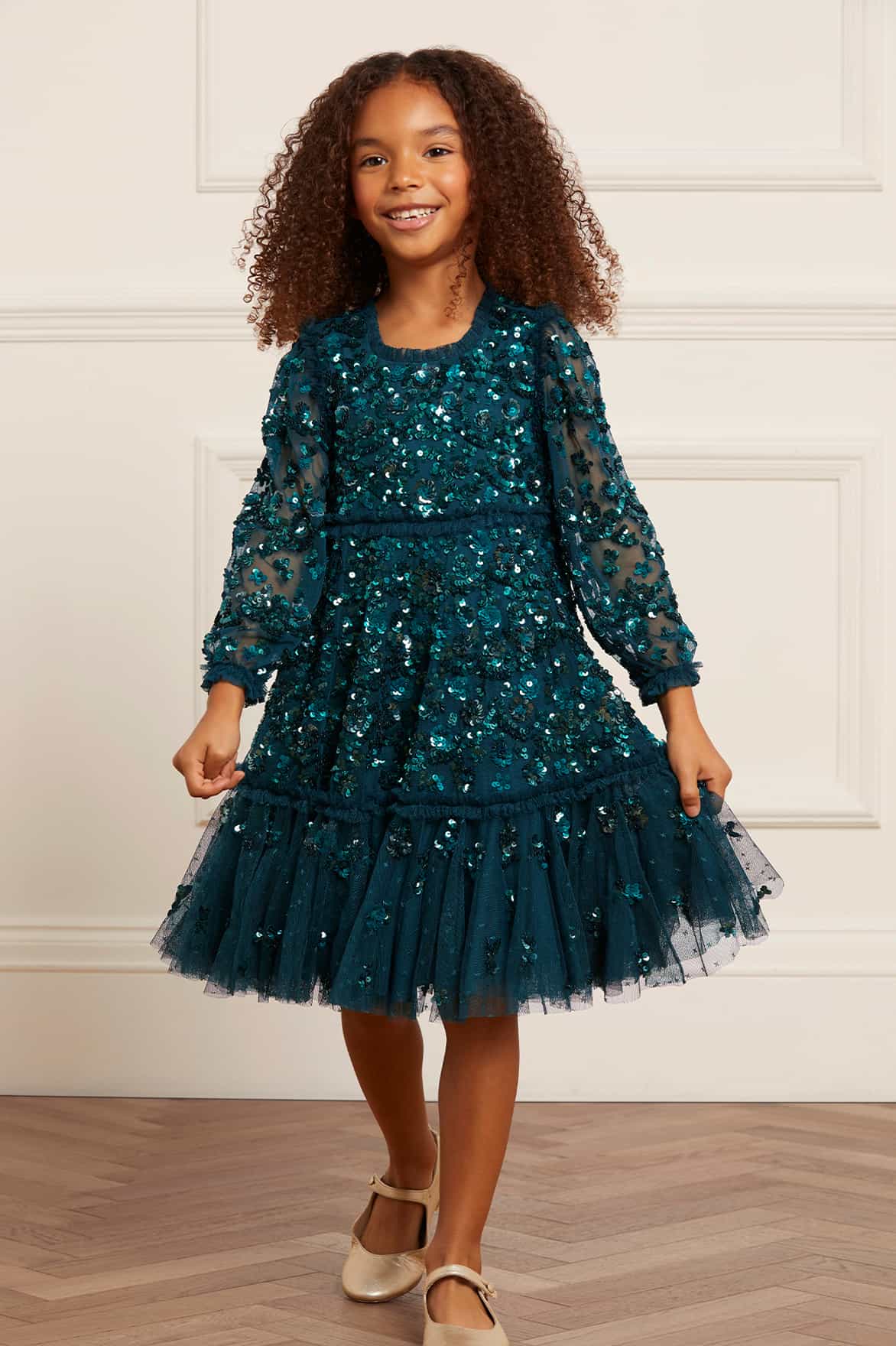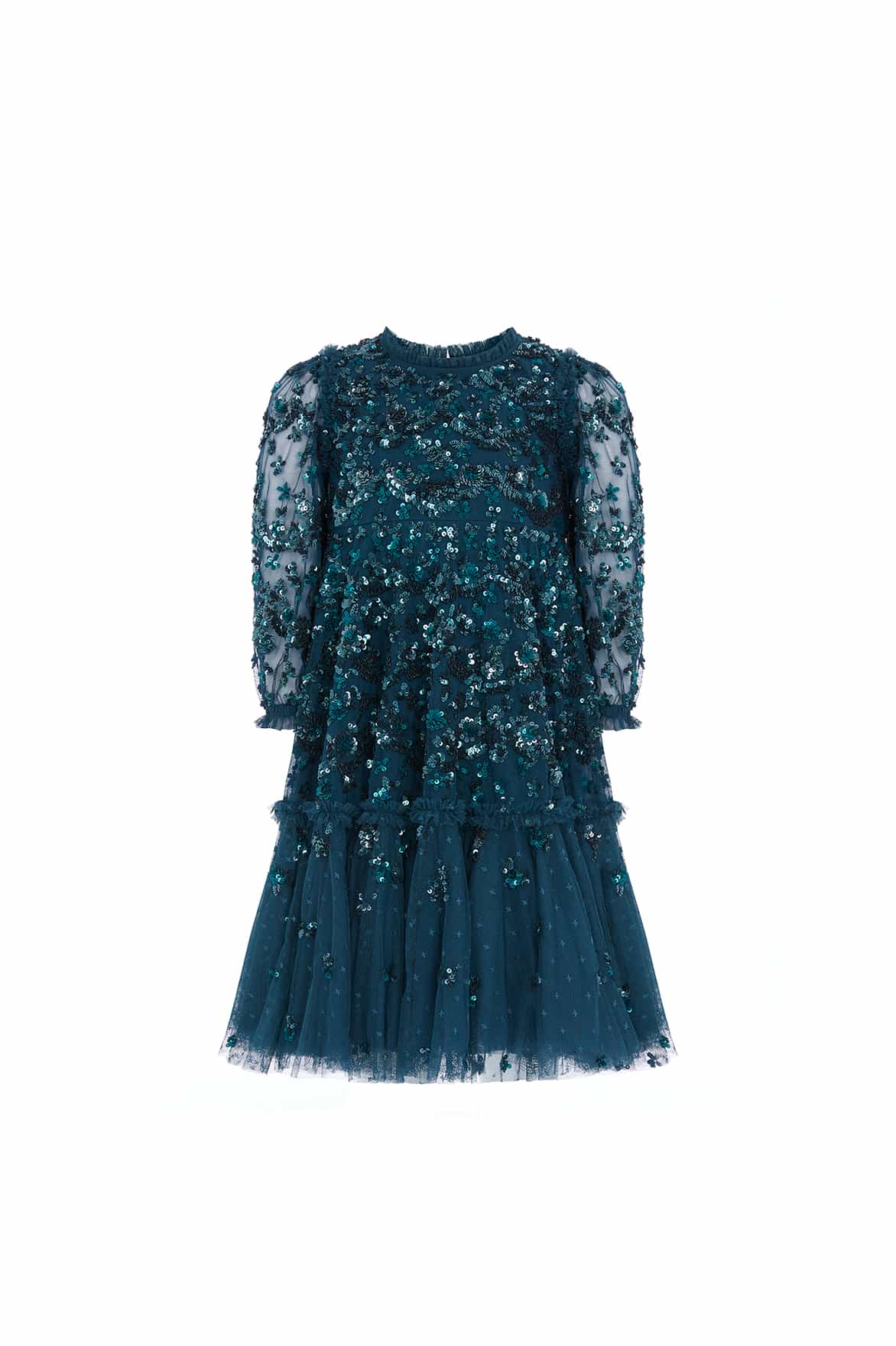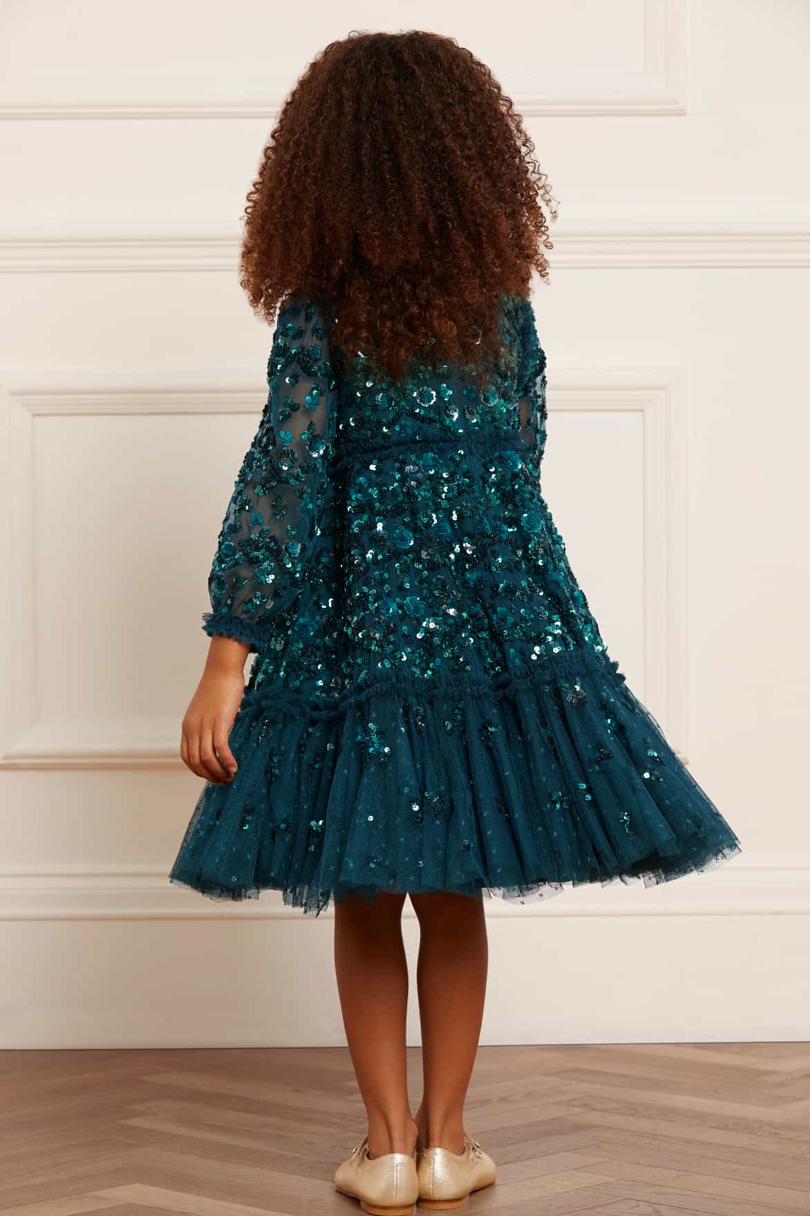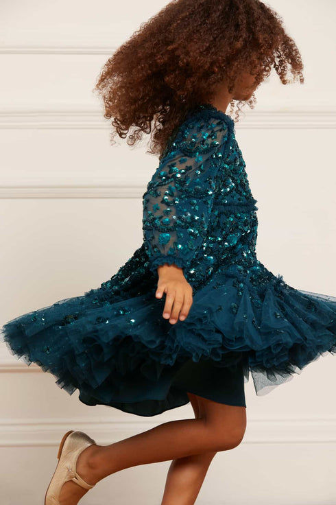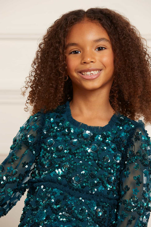 The Alina Sequin KIDS Dress in Emerald. This KIDS dress is designed elegantly with interlocking scallops and ditsy flower motifs, inspired by a 1940s artwork. Beautifully adorned with high-impact, lustrous sequins creating an all-over shimmering effect. Crafted with a sweeping hem-line for a playful shape. The Alina is a true fairytale piece in the collection.