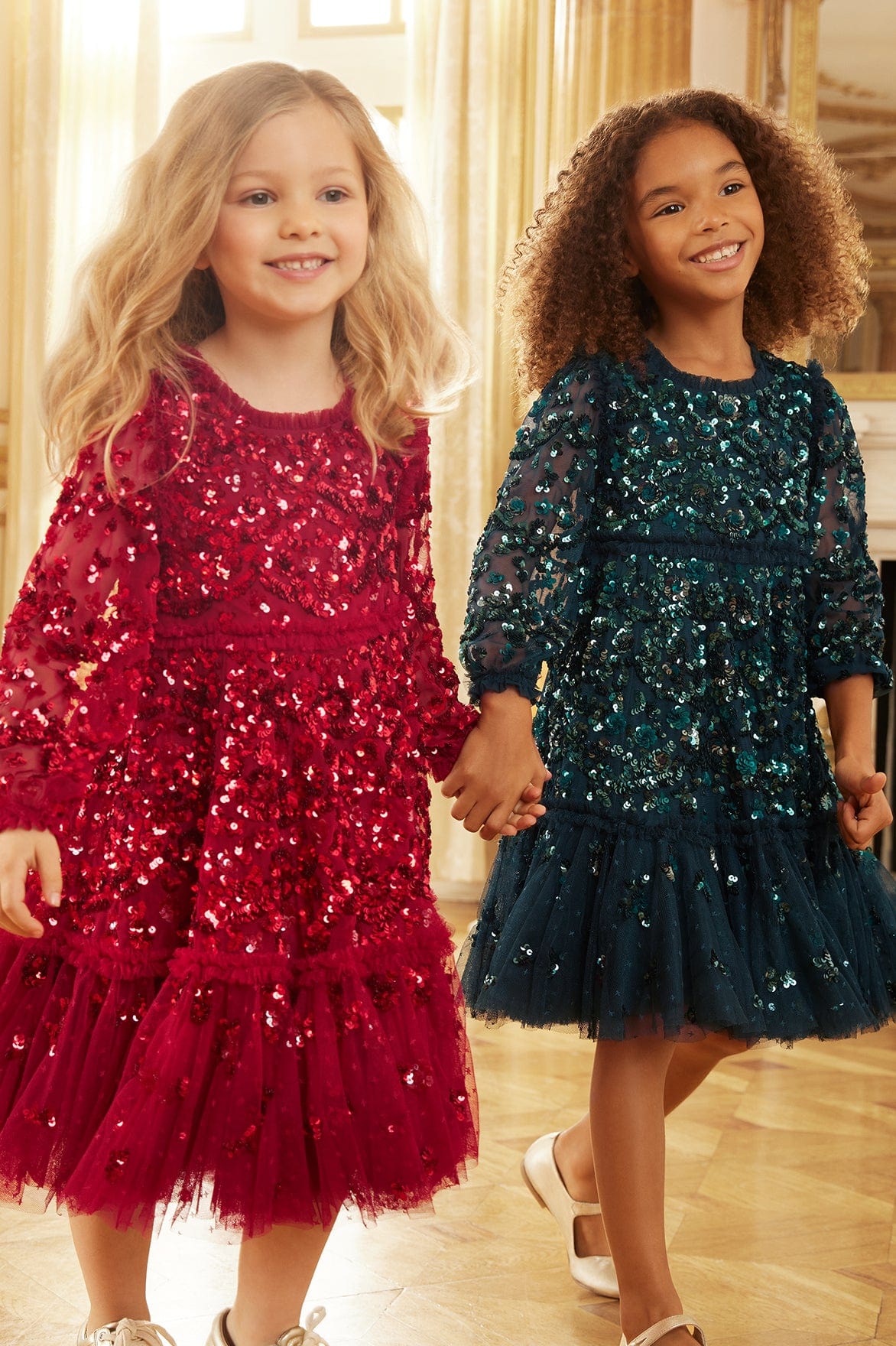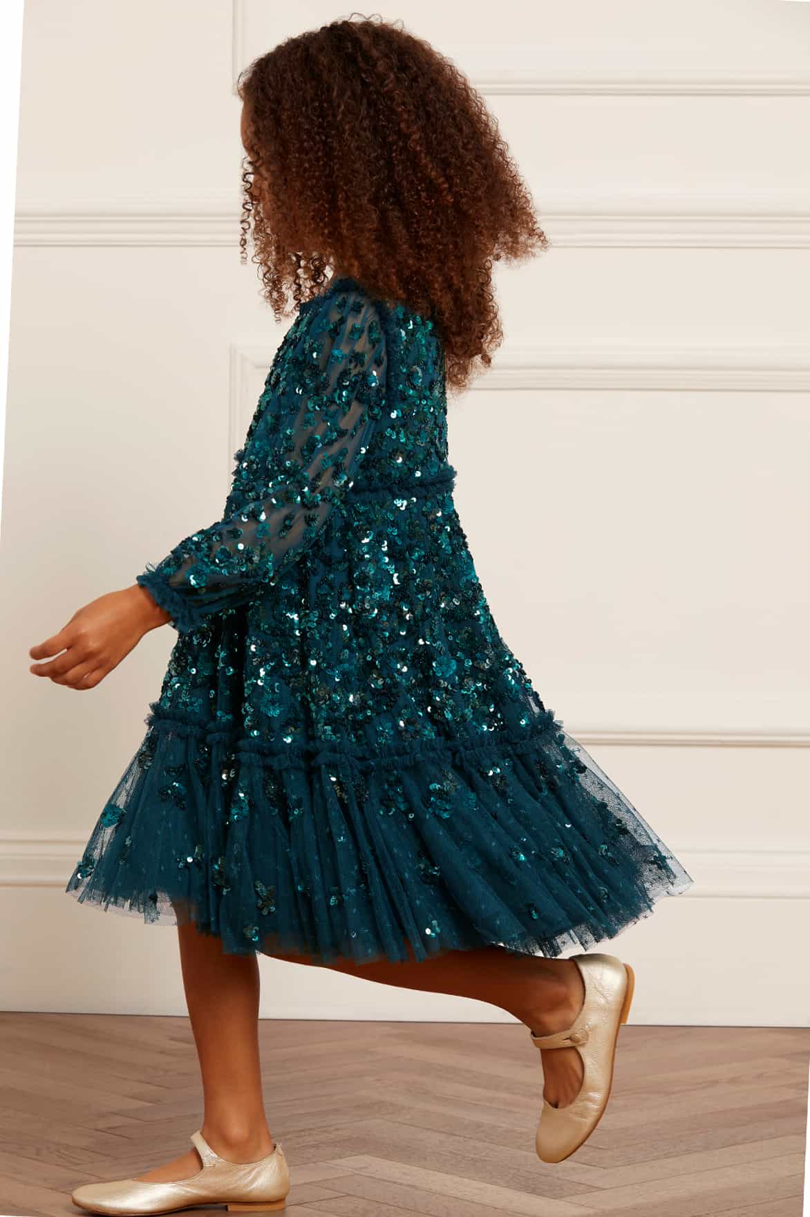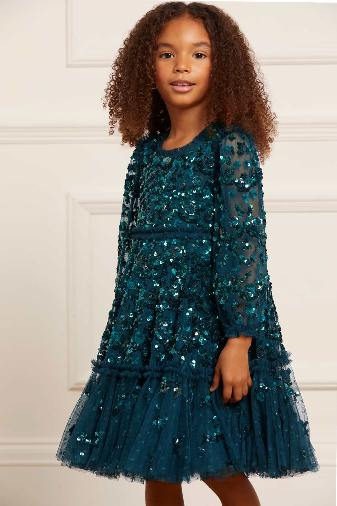 The Alina Sequin KIDS Dress in Emerald. This KIDS dress is designed elegantly with interlocking scallops and ditsy flower motifs, inspired by a 1940s artwork. Beautifully adorned with high-impact, lustrous sequins creating an all-over shimmering effect. Crafted with a sweeping hem-line for a playful shape. The Alina is a true fairytale piece in the collection.