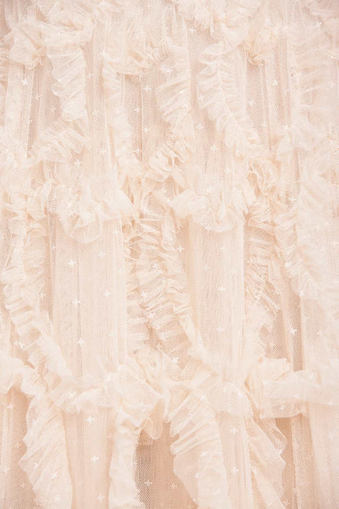 The Amorette V-Neck Gown in Cream. A signature Needle & Thread style; beautifully adorned with our key love heart motif, made from gently gathered delicate tulle. Designed with romantic, frothy sleeves created using layers of delicate tulle and frills for a statement look. Featuring a generously voluminous skirt layered with tulle and net for a full, magical silhouette. A textile piece you'll forever treasure.