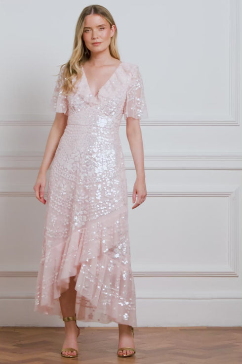 NEW SEASON. The Anais Sequin Frill Ankle Gown in Seashell. A beautifully romantic piece featuring lustrous sequins and frothy frills inspired by antique lace. Crafted from soft tulle with graceful movement, this gown evokes vintage artistry in a soft, feminine tone.