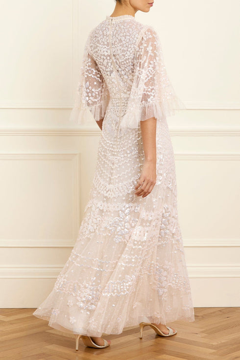 The Anais Sequin Gown in Cream/Dusk Pink. This beautiful statement style is inspired by charcoal drawings of vintage French lace from the early 1900s. This shimmering sequin gown features a dense border design, creating a lustrous effect. Designed with a romantic fluted sleeve featuring a deep gathered frill at the cuff for ethereal styling. The neckline and shoulders are adorned with signature Needle & Thread tulle ruffles. This is one of Needle & Thread's heritage pieces from the archive - A signature timeless piece.