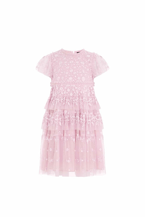 The Angelica Lace Kids Dress in Misty Lilac. This enchanting dress combines vintage-inspired elegance with playful charm. Delicate, intricate embroidery, reminiscent of classic Victorian lace trims, adorns the bodice, while soft tiered frills bring a touch of whimsy and movement. Crafted to capture timeless beauty, this dress is the perfect addition to your little one’s wardrobe—ideal for special occasions and everyday magic.