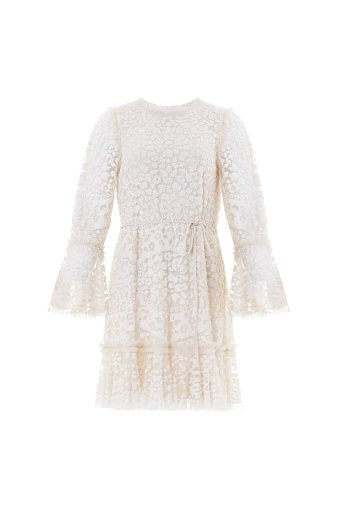 The Annie Sequin Tiered Mini Dress in Champagne. Adorned with shimmering sequins in a floral and bow artwork, this mini dress is inspired by a lace tablecloth. Designed with a loose fit silhouette and tiered throughout, creating beautiful movement. Make an effortless statement.