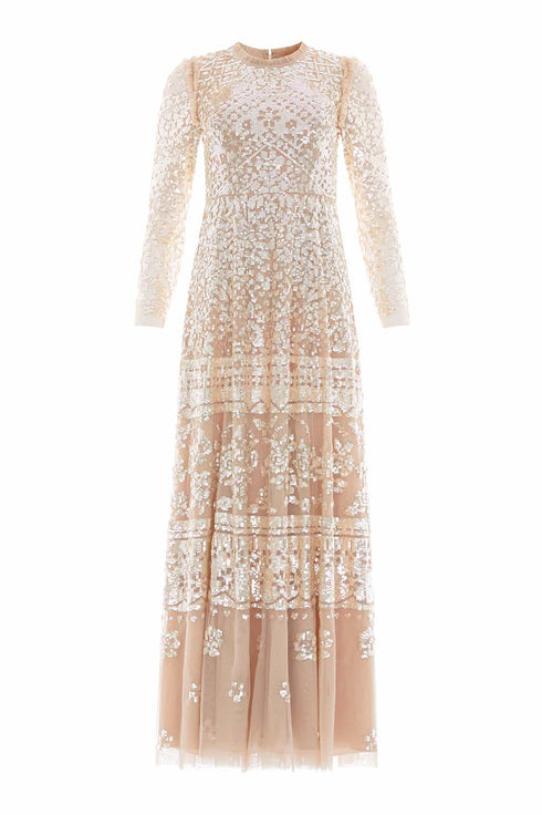 The Aurora Gown in Butterscotch/Gold. A signature Needle & Thread style from the archive, this timeless gown draws inspiration from antique tablecloths of the early 1900s. Intricately crafted with a shimmering placement border of sequins, it celebrates the art of vintage craftsmanship. The elegant silhouette features a round neckline, slim long sleeves, and delicate tulle frills at the neckline and armholes—a hallmark of the brand. Finished with layers of soft, romantic tulle, this heritage piece captures classic beauty with a modern edge.