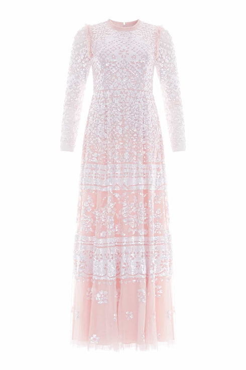 The Aurora Gown in Dusk Pink/Cream. A signature Needle & Thread style from the archive, this timeless gown draws inspiration from antique tablecloths of the early 1900s. Intricately crafted with a shimmering placement border of sequins, it celebrates the art of vintage craftsmanship. The elegant silhouette features a round neckline, slim long sleeves, and delicate tulle frills at the neckline and armholes—a hallmark of the brand. Finished with layers of soft, romantic tulle, this heritage piece captures classic beauty with a modern edge.