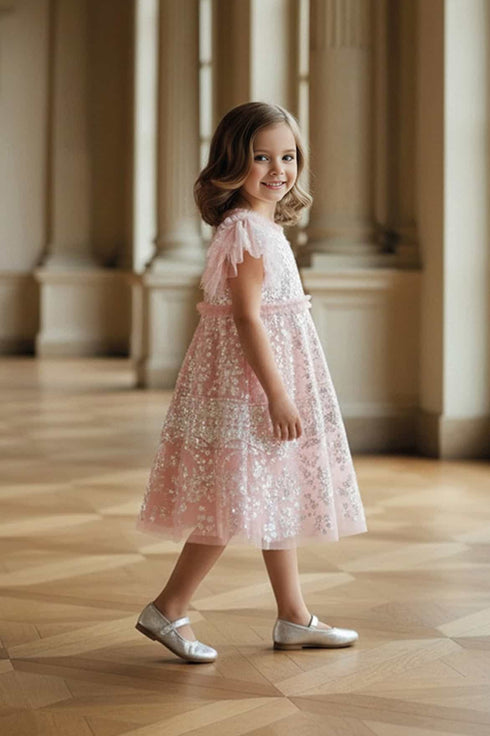 The Aurora KIDS Dress in Dusk Pink/Cream. A heritage style from the Needle & Thread archive, inspired by early 1900s antique tablecloths. Crafted with intricate sequin embroidery and signature tulle frills at the neckline, waist, and sleeves. Finished with a soft, layered tulle skirt for elegant movement. A dreamy fairytale dress that will make them feel like a true princess.