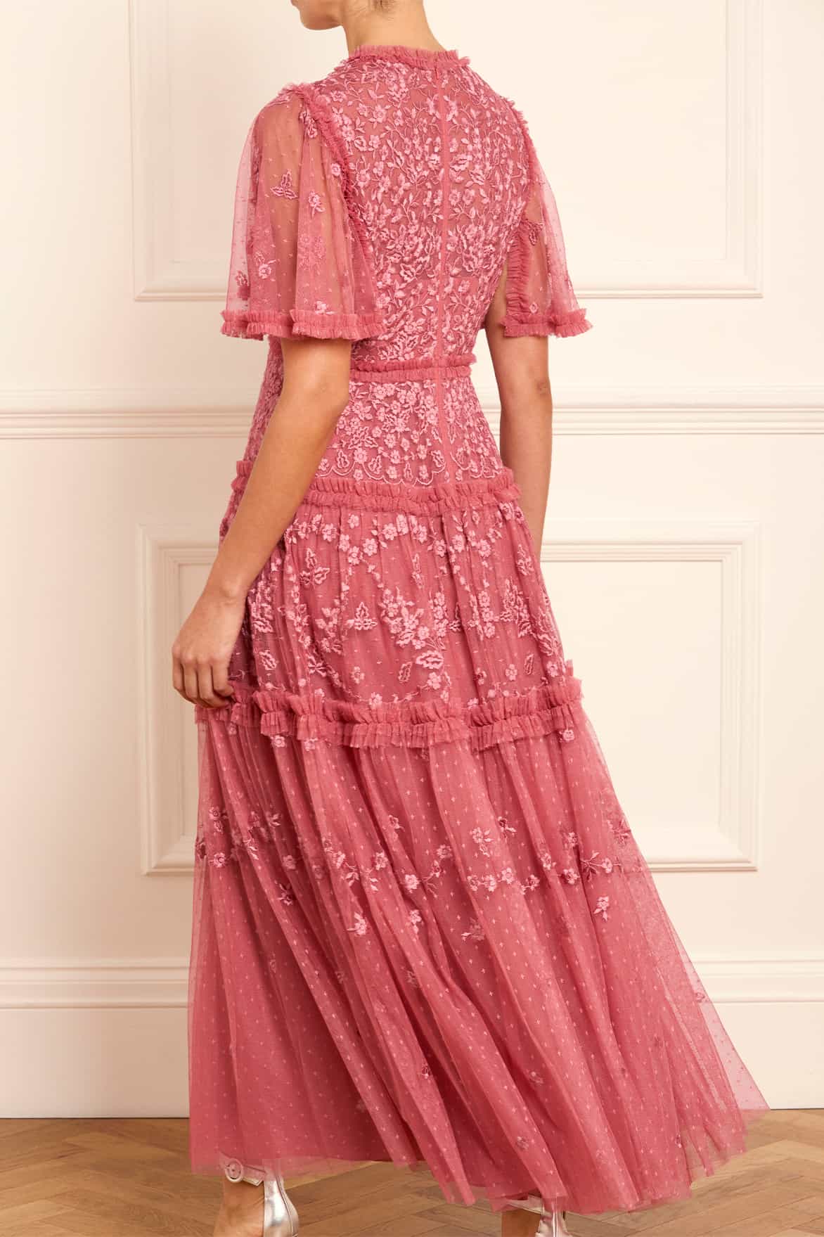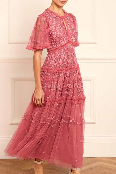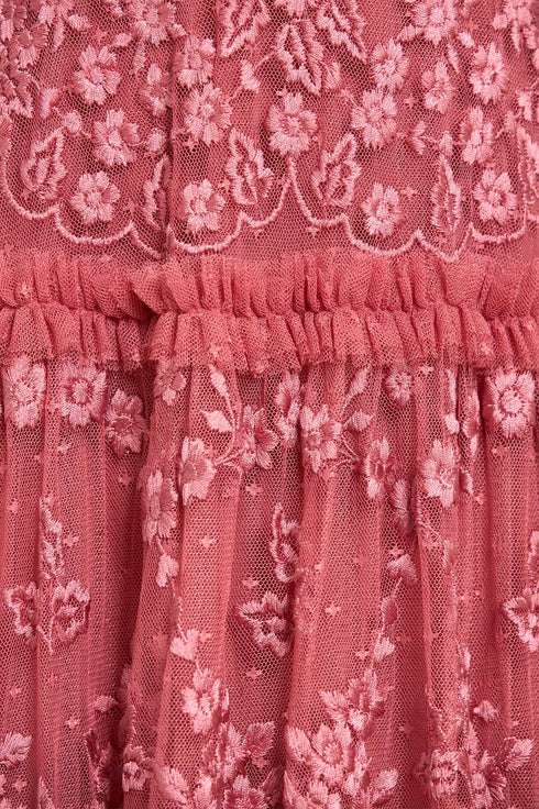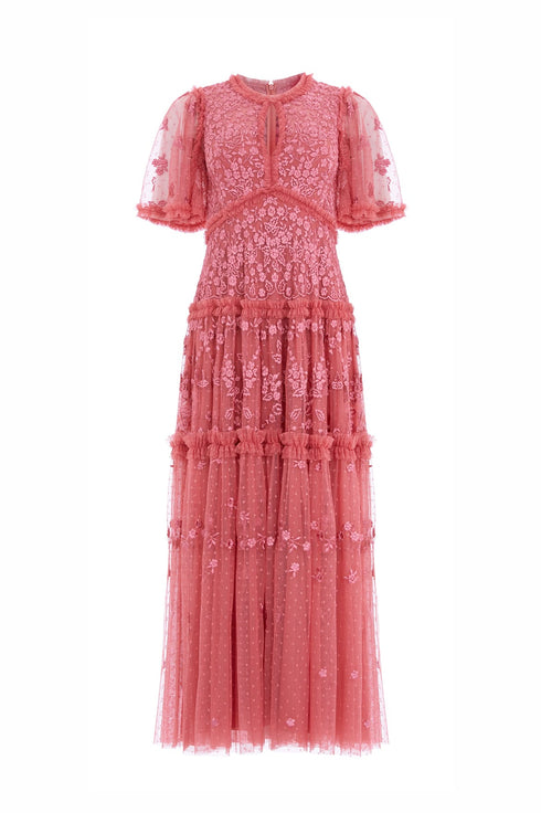 The Autumn Lace Ankle Gown in Autumn Rose. This signature Needle & Thread style is designed with floral motif embroidery inspired by antique lace designs. This gown is developed with romantic fluted sleeves, a gathered tiered hem, and is created from layers of soft tulle to create a flattering silhouette. A classic and contemporary style.