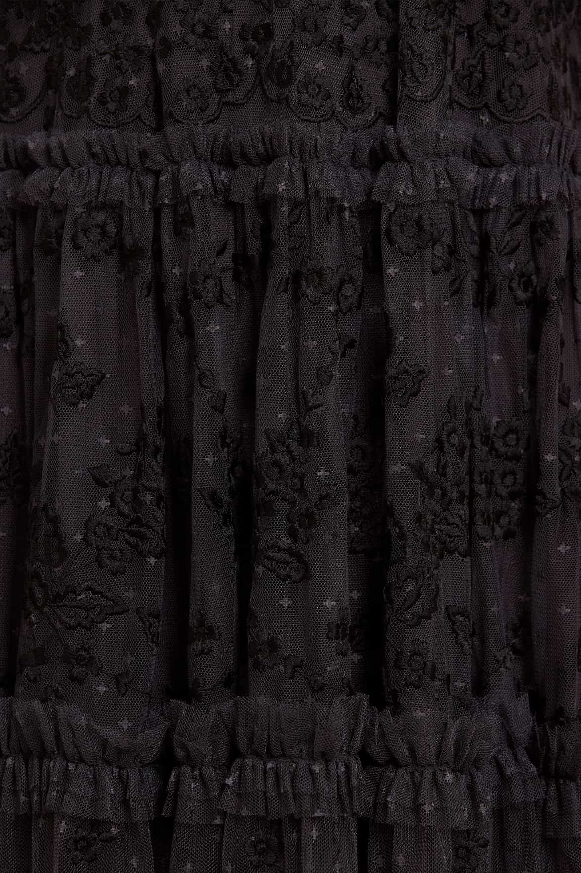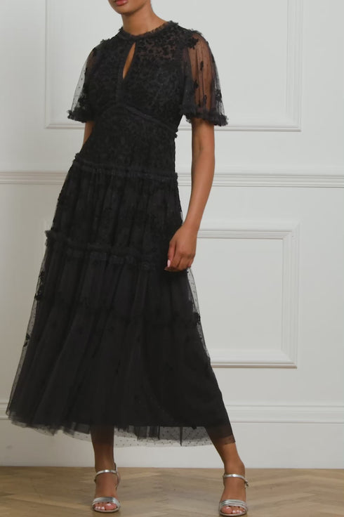 The Autumn Lace Ankle Gown in Graphite. This signature Needle & Thread style is designed with floral motif embroidery inspired by antique lace designs. This gown is developed with romantic fluted sleeves, a gathered tiered hem, and is created from layers of soft tulle to create a flattering silhouette. A classic and contemporary style.