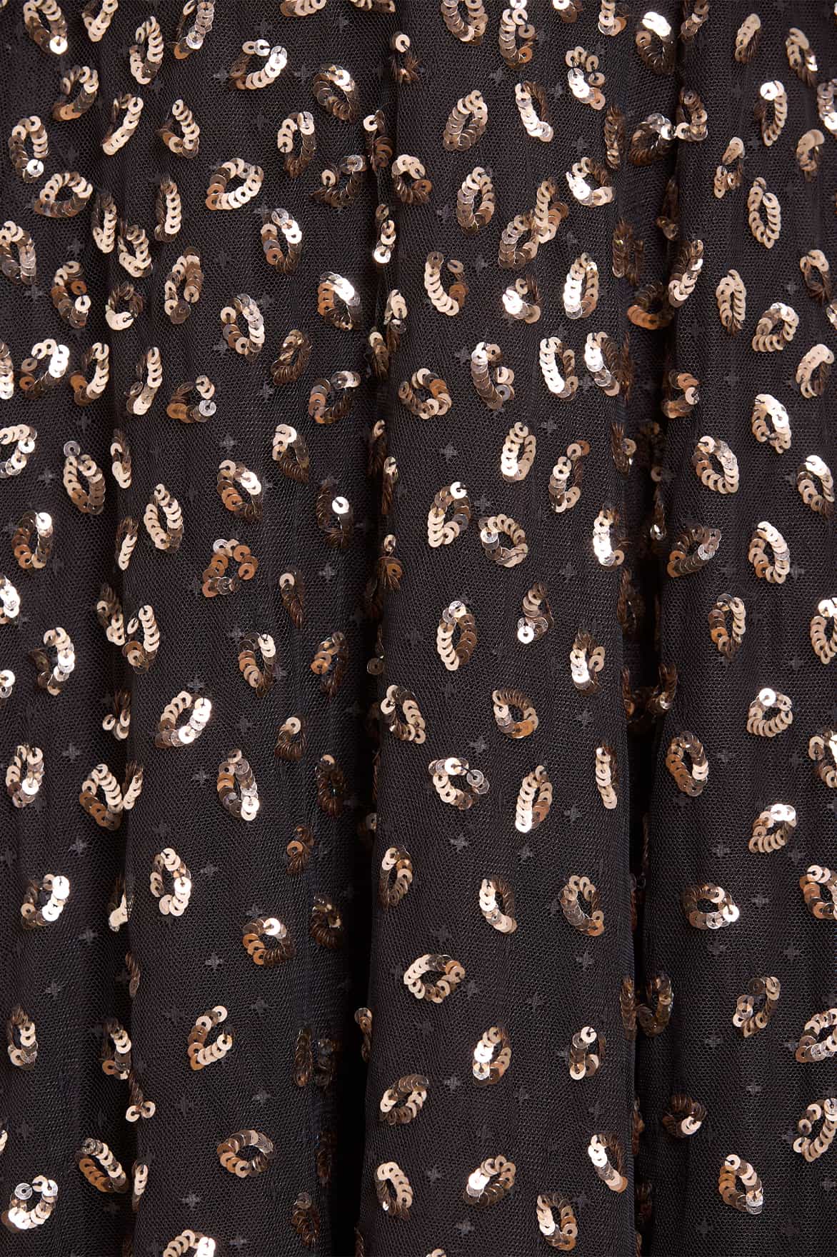 The Autumn Leaves Off-Shoulder Ballerina Dress in Graphite/Caramel. This ethereal piece is adorned with a glittering leaf motif that cascades gently towards the hem, capturing the essence of autumnal elegance. The dress features a romantic off-the-shoulder design complemented by tiered sleeves, each delicately edged with shimmering sequin embellishments. Crafted for comfort and style, the dress includes an internal corset made from stretch power mesh, ensuring a flawless fit while maintaining the garment's structure. The skirt is a true masterpiece, made up of layers of soft, delicate tulle and net, creating a generous and flowing silhouette that’s perfect for any special occasion.