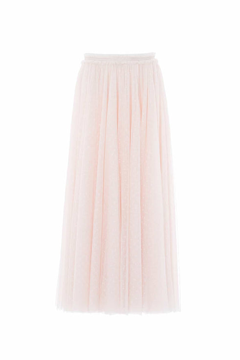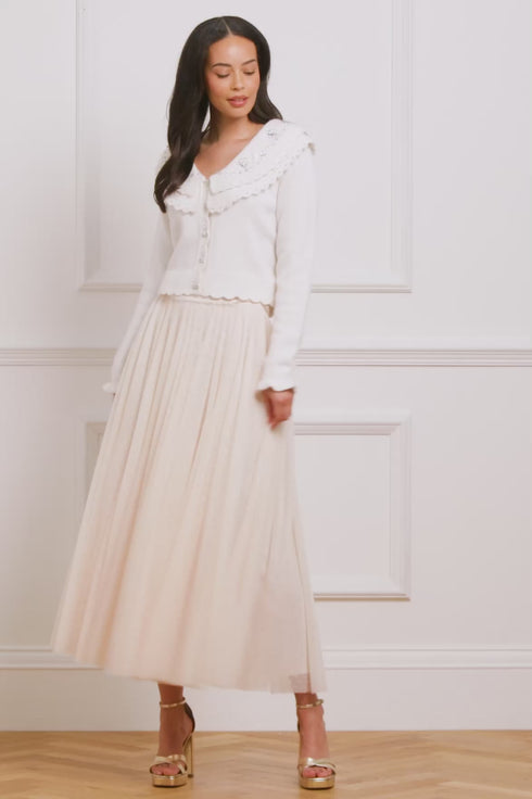 NEW SEASON. The Ballet Kisses Ankle Skirt in Cream/Opal. A dreamy layering piece made from soft signature 'x' motif tulle. Featuring frothy, tiered layers and a comfortable fitted waistband, this skirt offers graceful movement and a ballet-inspired silhouette. Style with the Embellished Collar V-Neck Cardigan for refined yet romantic day-to-evening dressing.