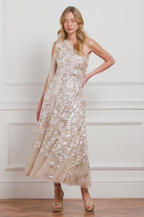 NEW SEASON. The Baroque Floral One-Shoulder Bow Ankle Gown in Oyster. A show-stopping piece with heritage drama, this gown draws on ornate 18th-century motifs reimagined in a modern silhouette. Designed with floral and scroll sequin embellishment, the asymmetrical neckline is adorned with a statement bow for couture-level impact. In soft oyster, this gown feels romantic, regal, and red carpet ready.
