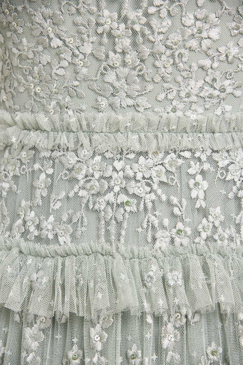 The Blossom Lace Ankle Gown in Laurel. A statement gown full of timeless elegance. Designed with a voluminous silhouette and cascading layered frills, this gown is adorned with delicate embroidery and subtle clear sequins that catch the light with every movement. A structured net layer adds definition, enhancing the gown’s dramatic shape. A truly show-stopping piece, perfect for unforgettable moments.
