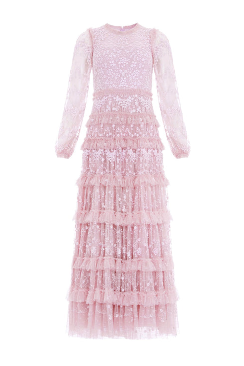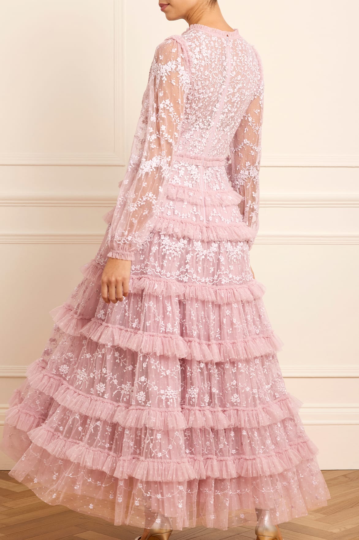 The Blossom Lace Ankle Gown in Misty Lilac. Beautifully designed with a voluminous silhouette and layered frills, this gown is beautifully decorated with intricate embroidery and subtle clear sequins. A statement piece with a net layer to accentuate its dramatic silhouette. A truly show-stopping style.