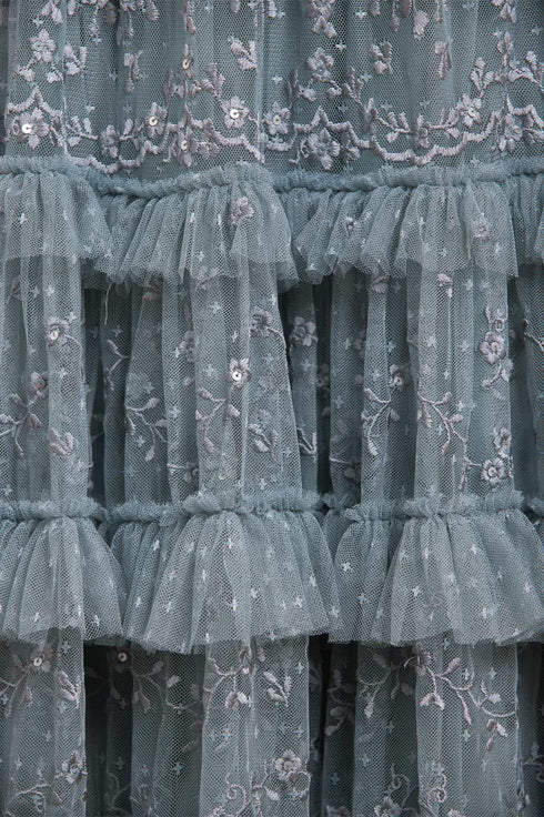 The Blossom Lace Ankle Gown in Thistle Blue. A statement gown full of timeless elegance. Designed with a voluminous silhouette and cascading layered frills, this gown is adorned with delicate embroidery and subtle clear sequins that catch the light with every movement. A structured net layer adds definition, enhancing the gown’s dramatic shape. A truly show-stopping piece, perfect for unforgettable moments.