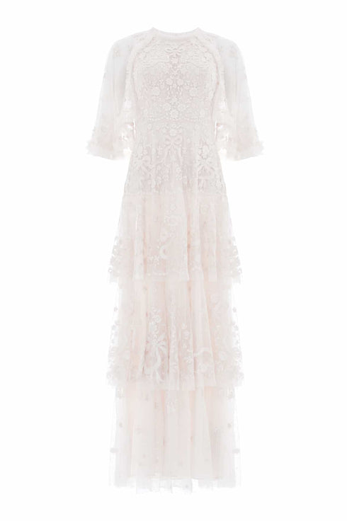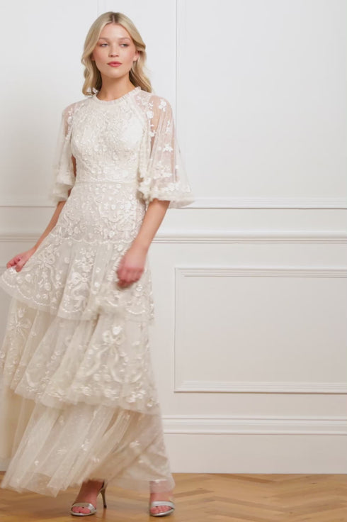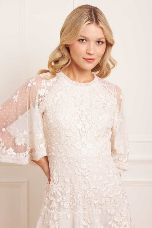 NEW SEASON | NEEDLE & THREAD EXCLUSIVE. The Bonne Bow Gown in Cream/Cream. Inspired by the timeless elegance of 1930s fashion, the Bonnie Bow Gown is a romantic showstopper. Crafted from delicate tulle, it features graceful cape sleeves that add a touch of movement to its flattering silhouette. Intricate ribbon and bow embroidery lends a whimsical charm, while soft, romantic tiers and trims complete the look. Effortlessly feminine and undeniably striking, the Bonnie is made to make an entrance.