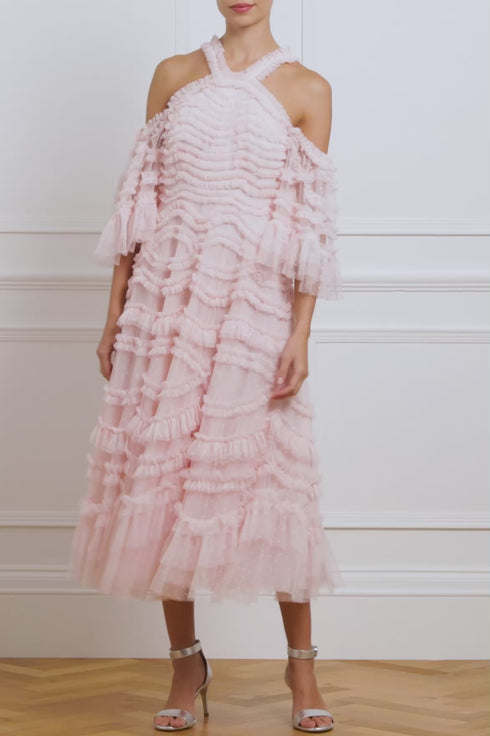 The Bronte Off-Shoulder Ballerina Dress in Dusk Pink. This beautiful dress features an exquisite textile meticulously developed in 3D by the designer, directly onto the mannequin. Beautifully developed with romantic, frothy frills arranged in intricate scallops and oval designs that gracefully adorn the bodice and skirt. The statement off-the-shoulder dress has a flattering curved neckline and straps, decorated with signature Needle & Thread soft tulle ruffles. The fluted sleeves are decorated in frothy tulle ruffles and trimmed with gathered frill tiers at the cuff. The silhouette is exceptionally flattering, with a fitted bodice that flows into a generous skirt made up of layers of net and tulle, culminating in a sweeping hemline that ensures a breathtaking entrance.