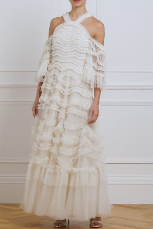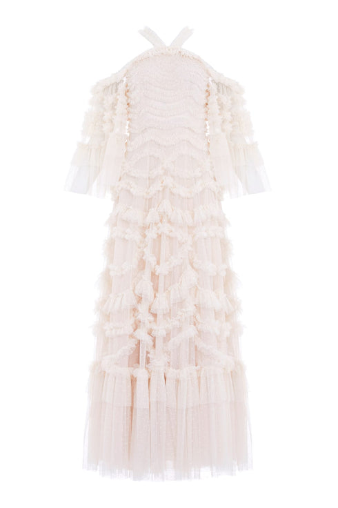 The Bronte Off-Shoulder Gown in Cream. This beautiful gown features an exquisite textile meticulously developed in 3D by the designer, directly onto the mannequin. Beautifully developed with romantic, frothy frills arranged in intricate scallops and oval designs that gracefully adorn the bodice and skirt. The statement off-the-shoulder dress has a flattering curved neckline and straps, decorated with signature Needle & Thread soft tulle ruffles. The fluted sleeves are decorated in frothy tulle ruffles and trimmed with gathered frill tiers at the cuff. The silhouette is exceptionally flattering, with a fitted bodice that flows into a generous skirt made up of layers of net and tulle, culminating in a sweeping hemline that ensures a breathtaking entrance.