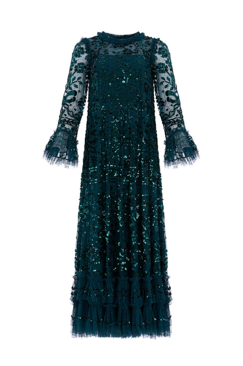 The Celia Long Sleeve Ankle Gown in Emerald. This statement gown is designed with romantic artwork featuring ornate florals and ribbon bows, densely embellished with shimmering sequins for exquisite detailing. Designed with an effortless loose fit with soft, playful tulle frills on the hem and cuffs. A key piece in our collection.