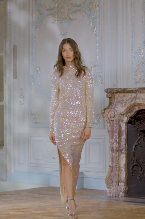 The Claudette Gloss Ankle Gown in Beige / Gold. This high shine gown is beautifully adorned with shimmering gloss sequins. Designed in a soft, stretch power mesh for ultra-comfort and fit. Crafted with a flattering and confident silhouette for a striking look. The perfect dress for a special event.