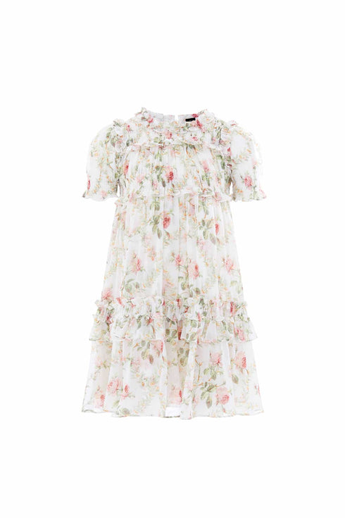 NEW SEASON. The Colette’s Rose Emilia Georgette Kids Dress in Moonshine. A light and airy dress for little ones. Adorned with our heritage-inspired rose print, the dress features shirred detailing and a gently flared shape. A delightful match to the women's Emilia Georgette styles for truly unforgettable twinning moments.