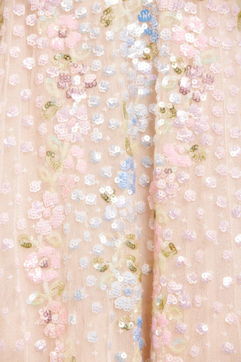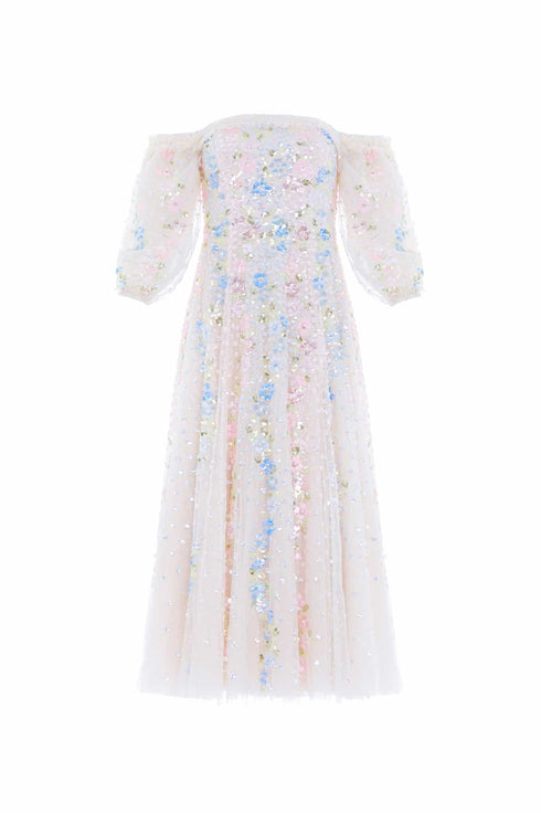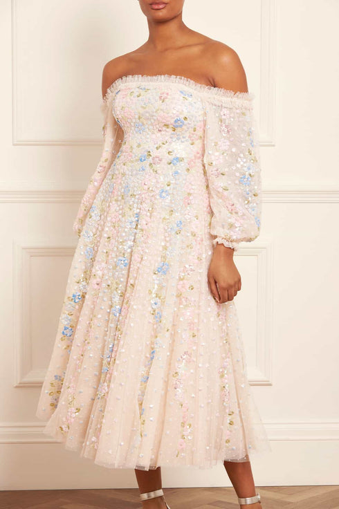 The Confetti Gloss Off-Shoulder Ballerina Dress in Cream / Multi. Beautifully decorated with sequin embellishment in soft flower motifs that scatter and disperse down this style in the most romantic confetti artwork. This off-shoulder style features elasticated arms adorned with soft tulle ruffles to add signature detail. The sleeves are designed using layers of tulle net for a soft yet structured look, and the skirt is crafted with tulle net for a sweeping hemline. The perfect piece for a special upcoming occasion.