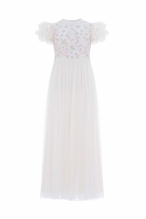 The Dahlia Bodice Round Neck Ankle Gown in Cream. The bodice of this gown is scattered with intricate floral embroidery in pink pastel tones. Beautifully decorated with shimmering silver sequins in delicate dot motifs. The skirt is developed with layers of our signature Needle & Thread tulle for a statement look. The perfect style for all your upcoming events and beyond.