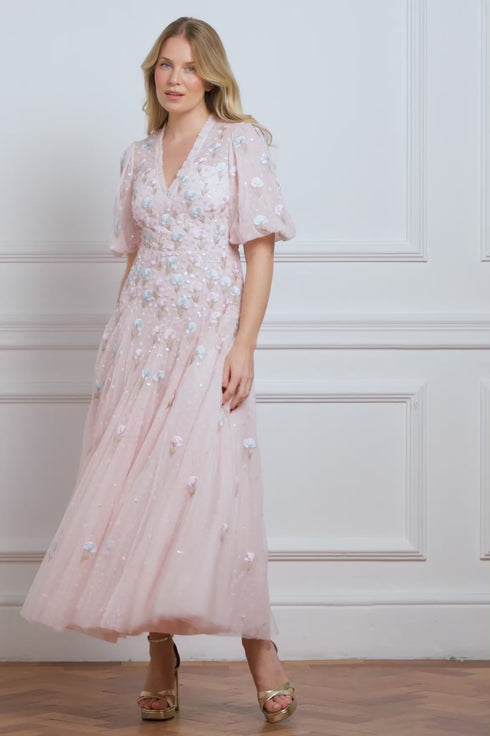 NEW SEASON. The Dandelion Ditsy Ankle Gown in Seashell. Decorated with delicately stitched dandelion motifs in soft pastel tones. Crafted from airy tulle that fades gently towards the hem, this gown captures a dreamy, ethereal feel perfect for special occasions.