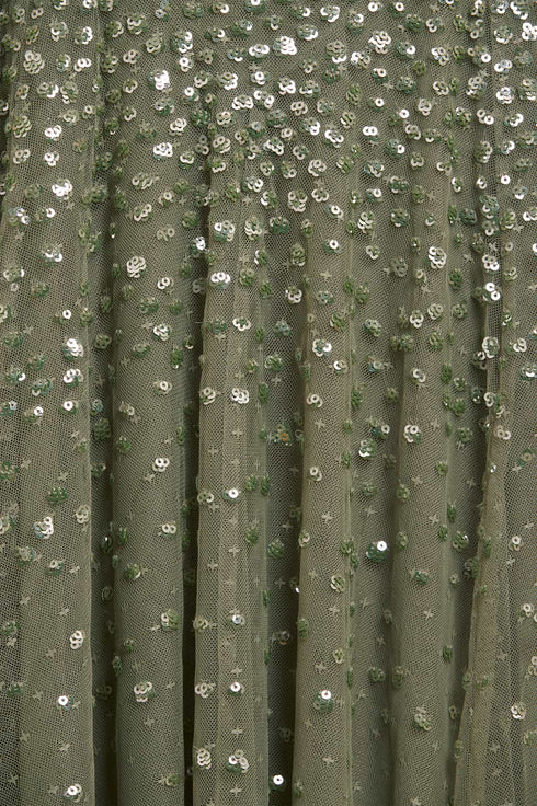 The Dappled Sequin Cape Ankle Gown in Fern. A gracefully romantic design for the This ethereal gown features an integrated cape with softly gathered frill detailing, adding fluid movement and a touch of drama. Crafted with delicate clusters of shimmering sequins intricately scattered across the fabric, creating a light-catching, dappled effect. Designed with signature Needle & Thread tulle ruffles framing the neckline, while chevron seaming sculpts the waist and hips before falling into a voluminous, frothy skirt. Crafted from generous layers of net and tulle, this gown is destined for truly unforgettable moments.