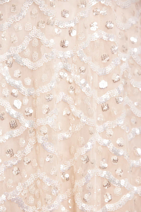 The Deco Dot Gloss Ankle Gown in Cream. This style has an artwork inspired by 1930’s art deco styling. Developed with layered tulle sleeves and a sequin border edge for 1930’s romantic styling. The perfect gown for an upcoming special occasion.