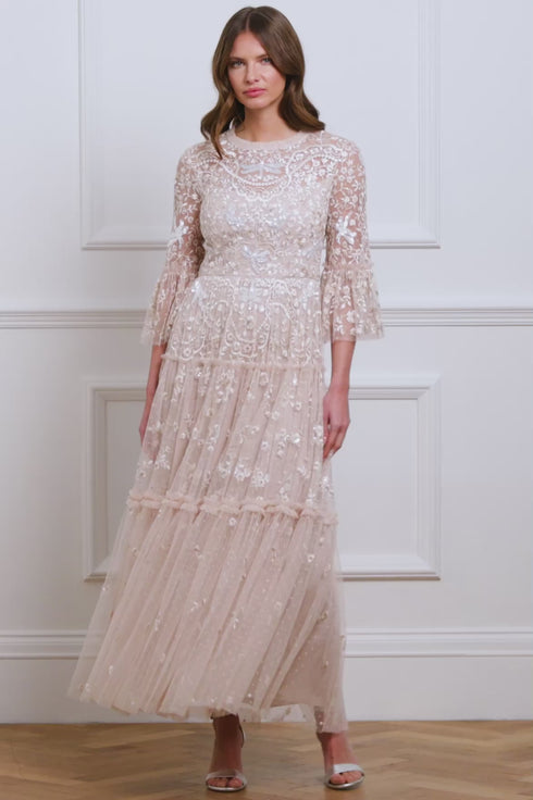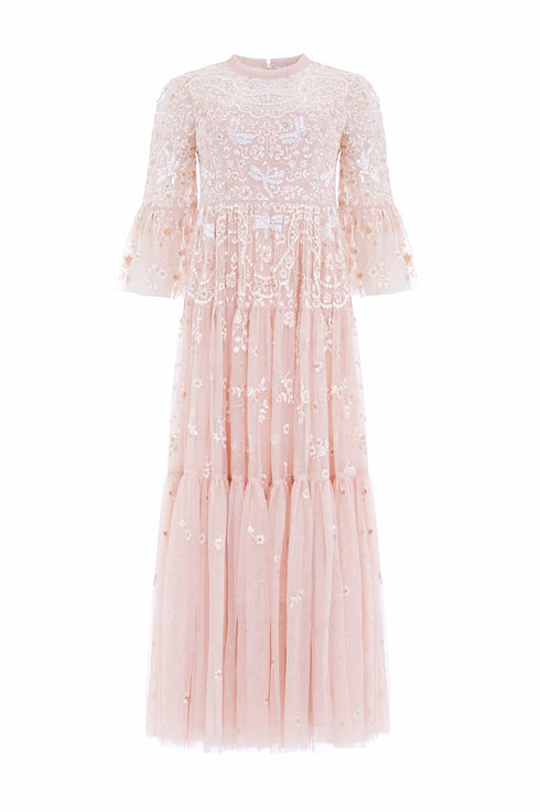 The Dragonfly Garden Ankle Gown in Pearl Pink/Neutral. This gown features intricate vintage lace-inspired embroidery, adorned with whimsical sequin dragonflies and trailing florals. Developed with signature Needle & Thread tulle frills accentuate the neckline, while the skirt boasts softly gathered tiers with a tulle underlayer for a romantic finish. Designed with slim sleeves and detailed with fluted gathered frill cuffs. A heritage design from the Needle & Thread archive, this timeless gown is a true wardrobe classic.