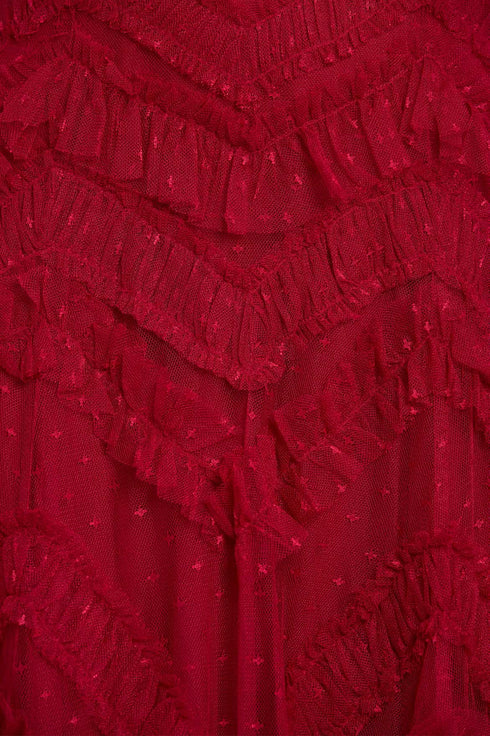 The Elia Short Sleeve Gown in Red. This statement signature Needle & Thread textile style is created in-house in our atelier for a perfectly proportioned frill layout. The soft zigzag design is made of tulle ruffles that gradually increase in size towards the hem. Crafted with romantic, frothy sleeves using delicate tulle adorned with frills and ruffles at the cuff. The skirt is composed of generous layers of net and tulle with a sweeping hemline. A go-to piece you'll forever treasure.