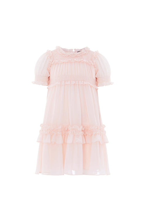 NEW SEASON. The Emilia Georgette Kids Dress in Opal. A light and flowy silhouette crafted in delicate georgette. With gentle shirring at the waist and sleeves, this piece is perfect for flower girls or any special event. Style with the matching women's Emilia Crepe Dress for a sweet family matching moment.