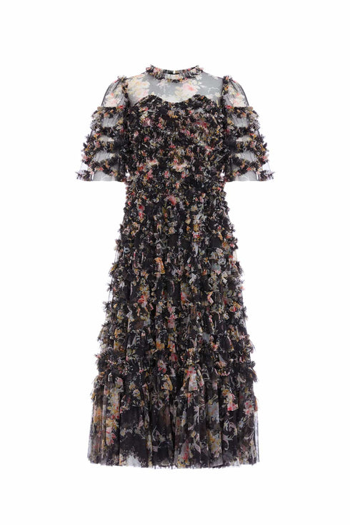 The Enchanted Garden Bronte Ballerina Dress in Graphite. This dress is printed with a signature Needle & Thread print, taking inspiration from an archival hand-painted wallpaper design, bringing to life romantic garden florals and historical motifs. The textile was meticulously developed by the designer in 3D directly onto the mannequin, resulting in perfectly proportioned, romantically frothy frills arranged in intricate scallop and oval designs. Designed with a sheer yoke adding an extra touch of romance, while the softly gathered hem is adorned with layers of frills, enhancing the gown’s ethereal beauty. This gown boasts a flattering silhouette, with a bodice that hugs the figure and a skirt made up of generous layers of net and tulle, creating a sweeping hemline that exudes grace and sophistication. Perfect for any special occasion, the Enchanted Garden is a breathtaking blend of history and couture craftsmanship, designed to make a lasting impression.