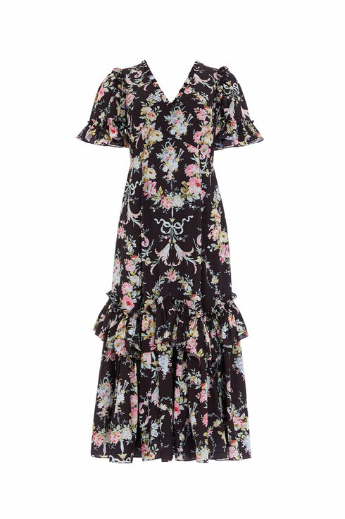 The Enchanted Eva Crepe Ballerina Dress in Graphite. A signature Needle & Thread print inspired by an archival hand-painted wallpaper design. This exquisite artwork brings to life a vision of romantic garden florals and historical motifs, beautifully translating the past into contemporary fashion. Inspired by 1930s tea dresses, it is adorned with elegant frills and offers an effortless, flattering fit with a V-shaped waist seam. The romantic fluted sleeves are detailed with frills, making this dress perfect for any occasion.