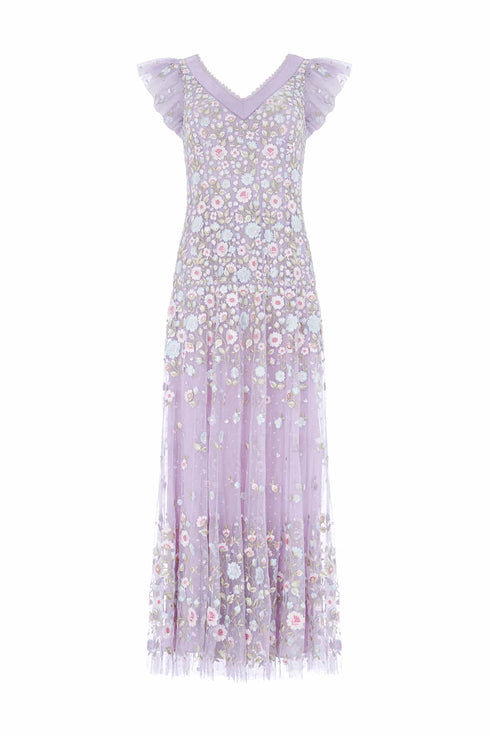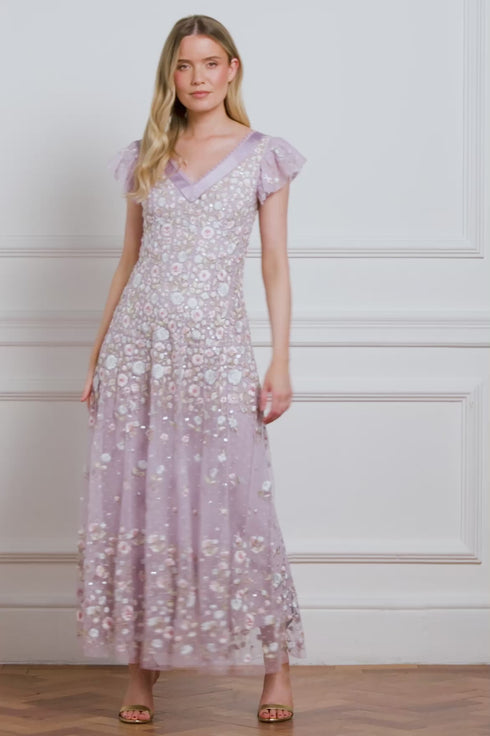 NEW SEASON. The Ethereal Blooms Short Sleeve Ankle Gown in Lavender/Multi. Features intricate trailing floral embroidery in soft pastel tones. Designed with short sleeves and a graceful A-line silhouette, this gown captures romantic movement and ethereal beauty with a subtle shimmer throughout.