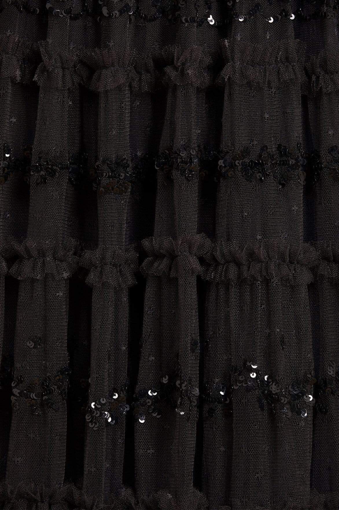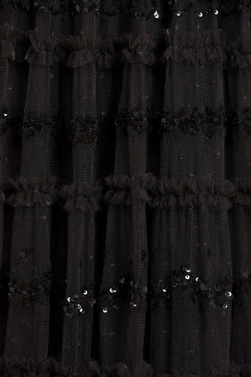The Eve Sequin Gown in Graphite. This gown is romantically designed with a flattering, gently gathered bodice and full sleeves. Crafted with layers of our signature kisses tulle, and intricately adorned with shimmering sequin borders in pretty, lace-inspired designs. Make a statement in the Eve this season.