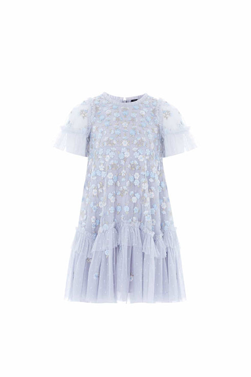 NEW SEASON. The Evening Primrose KIDS Dress in Cornflower Blue. This dress is decorated with intricate floral embroidery, inspired by a 1930’s tea dress. Beautifully engineered with chevron frills on the hem. Developed with our signature Needle & Thread tulle. The perfect dress for all your little one's upcoming occasions.