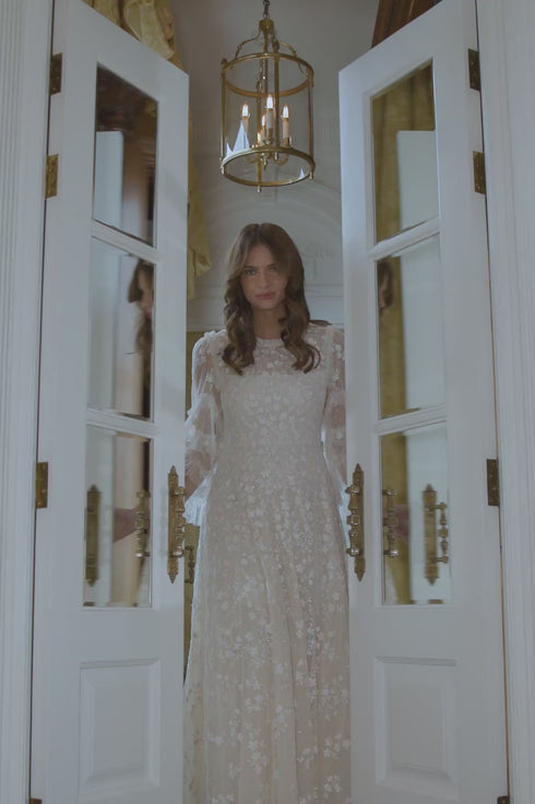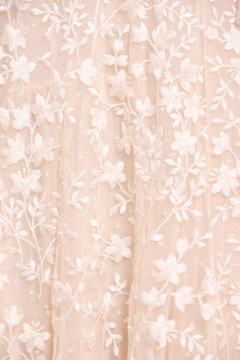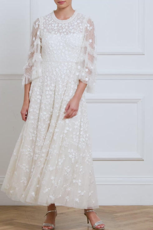 The Everett Bloom Round Neck Ankle Gown in Cream/Cream. This beautiful gown features exquisite, embroidered artwork inspired by a vintage archive print that showcases floating florals. Beautifully decorated with floral clusters cascading gently toward the hem, enhancing the romantic charm. Designed with fluted sleeves adorned with frothy tulle ruffles and embroidered floral motifs, while the neckline, shoulders, and cuffs feature signature Needle & Thread tulle frills for a touch of romantic elegance. The skirt is composed of generous layers of net and tulle, culminating in a sweeping hemline that adds to the gown's enchanting allure.